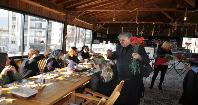 Daha sonraları proğrama katılan kadınların gününü kutlayarak tek tek karanfil verdi.