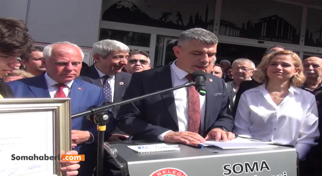 Manisa'nın Soma ilçesinde 31 Mart seçimlerinden sonra seçimi kazanan Cumhuriyet Halk Partisi CHP belediye başkan adayı ve belediye meclis üyeleri mazbatalarını aldılar.