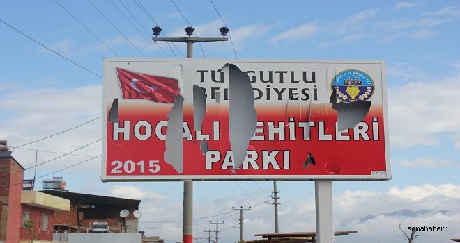 TURGUTLU Belediyesi’nin meclis kararıyla ‘Hocalı Şehitleri Parkı’ adını vererek hizmete açtığı parkın tabelası kimliği belirsiz kişi veya kişilerin saldırısına uğradı. Üzerinde Türk Bayrağı’nın da yer aldığı tabelaya yapılan bu saldırıyı kınayan Turgutlu Belediye Başkanı Turgay Şirin, “Yapılan bu saldırıyı esefle kınıyorum. Bir arada yaşadığımız ilçemizde bu ve buna benzer olayların yaşanmamasını diliyor, tabelanın en kısa zamanda yenileneceğinin bilinmesini istiyorum” dedi.