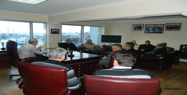 Soma Kamyoncular Kooperatifini ziyaret eden CHP İlçe Başkanı Murat Bayramoğlu ve Soma Belediye başkan adayı Bahri Yılmaz ve yönetim kurulu üyeleri Kooperatif Başkanı Mehmet Yağcıyı makamında ziyaret ettiler
