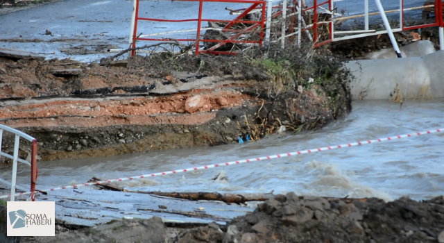 [12:21, 03.02.2021] osmanbekkar: Soma’da iki gündür yağan kuvvetli yağışlar beraberinde bazı noktalarda mağduriyeti de getirdi. Mezbahane altında İstasyon Mahallesi ile bağlantıyı sağlayan köprü göçtü, neyseki o anda köprü üzerinde araç trafiği olmaması olası bir faciayının da önüne geçti.