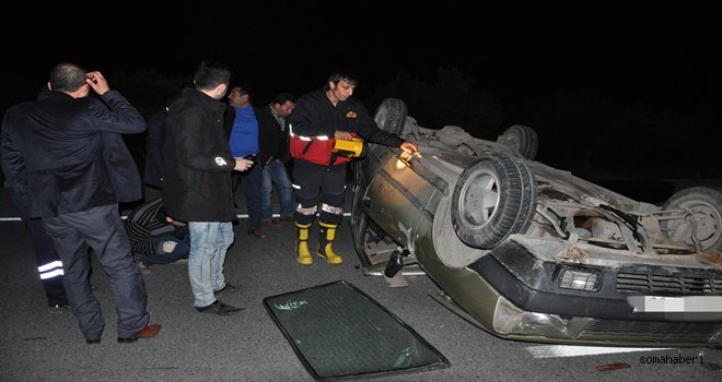 Akhisarın Selvili mahallesi yakınlarında dün saat 23 00 Sıralarında 45HC...Plakalı otomobil ile Soma ya giderken bir anda aracın ters dönmesi nedeniyle araçtaki sadece aracı kullanan kişi yaralanırken araçtaki yaralıyı yoldan geçenlerler kurtardılar Araçtan dökülen benzin aracın yanma ihtimaline karşın bekleyen araç sahipleri tarafından tetbirleri alınarak 112 ve Krkağaç ve Akhisardan gelen itfaiye ekipleri tarafından yol yıkanarak trafiğe açıldı.Araçta başka yaralıların olmaması ve Kazanın ucuz atlatılması bekliyenleri sevindirdi.