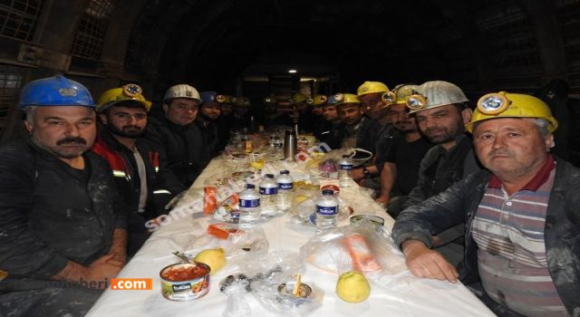 Soma’nın geçim kaynaklarından biri olan linyit kömürünün çıkarılması için çalışmalar 3 vardiya halinde 5000 kişinin çalıştığı iş yerinde 24 saat içerisinde 5000 ton kömür çıkarılıyor.Soma ilçesine bağlı Eynez mahallesindeki özel bir maden şirketinin kömür ocağında 16.00 24.00 vardiyasında çalışan madenciler, diğer ocaklarda olduğu gibi Ramazan ayının ilk iftarını yerin metrelerce altında yaptı. Masada evlerinden getirdikleri iş yerinin verdiği iftarlıklarla sofraı kuran madenciler, mesailerine ara vererek.Gelen telefonla oruçlarını açmak için dua edip yemek yedi.