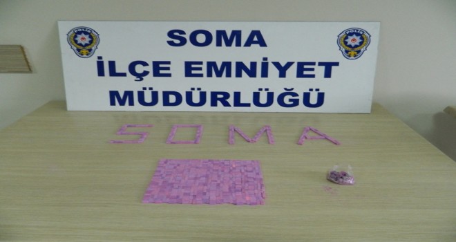 Soma İlçe Emniyet Müdürlüğü Asayiş Büro Amirliğince Soma’nın en işlek caddelerinden biri olan Atatürk Caddesi üzerinde uyuşturucu kullanımı ve ticareti ile ilgili yapılan çalışmalar sonucunda O.K. (62) isimli şahıs üzerinde 822 adet sentetik uyuşturucu hap ile birlikte yakalandı. O.K. emniyetteki sorgusunun sonra sağlık kontrolleri sonrası adliyeye sevk edildi.