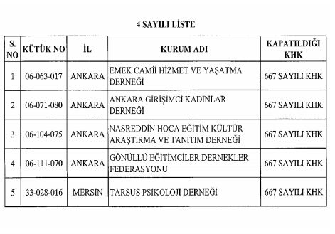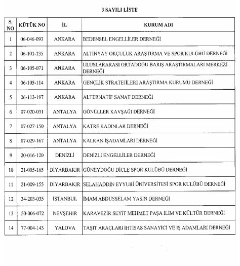 (3) Ekli (4) sayılı listede yer alan dernekler, ilgili kanun hükmünde kararnamenin eki listelerin ilgili sıralarından çıkarılmıştır. İlgili kanun hükmünde kararname hükümleri, söz konusu dernekler bakımından tüm hüküm ve sonuçlarıyla birlikte ilgili kanun hükmünde kararnamenin yürürlük tarihinden geçerli olmak üzere ortadan kalkmış sayılır. Buna ilişkin işlemler ilgisine göre İçişleri Bakanlığı ve Maliye Bakanlığı tarafından yerine getirilir.