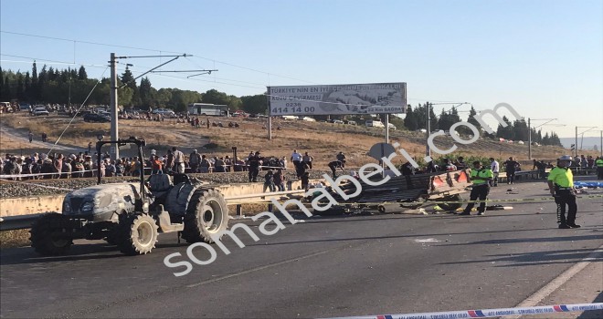 Manisa’nın Saruhanlı ilçesinde üzüm işçilerini taşıyan traktör ile transtin çarpışması sonucu meydana gelen kazda 2 kişi öldü 9 kişi de yaralandı. Çarpışmanın etkisiyle açık kasa traktör römorkunda bulunan üzüm işçileri asfalt yola savrulurken ortalık adeta savaş alanına döndü. Kaza Manisa’nın Saruhanlı ilçesinde İstanbul-İzmir Karayolunun Tirkeş Mahallesi kavşağında meydana geldi. Sabahın erken saatlerinde üzüm işçilerini açık kasa römorkunda taşıyan 45 UB 3159 plakalı traktörün ana yola çıktığı sırada Akhisar yönünden Saruhanlı istikametine gitmekte olan 45 NN 699 plakalı transitin çarpışmasıyla traktörün açık kasasında bulunan tarım işçileri asfalt yola savruldu. Kazada traktör kasasında bulunan 2 kişi olay yerinde hayatını kaybederken 9 kişi de yaralandı. Çarpışmanın etkisiyle minibüs de refüje çıkarak durabildi. Olay yerine çok sayıda ambulans ve trafik ekibi sevk edilirken kazanın olduğunu duyan işçilerin yakınları da kaza yerine akın etti. Kazayla ilgili soruşturma başlatıldı.