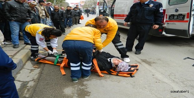 Atatürk caddesinde 13 Eylül Pide Fırını karşısında saat 1300sıralarında karşıdan karşıya geçmek isteyen Sevim Ö… 53 Aptullah K…… 19 Kullandığı 45 YA 6..4..Plakalı Motosiklete Yolu geçmek ile geçmemek arasında kararsız olan Bayan kazaya neden oldu. Kırkağaç’tan Hasta getiren 112 gelmesiyle yaralanan bayan Soma Devlet hastanesine kaldırıldı. Tedavi altına alındığı öğrenildi.